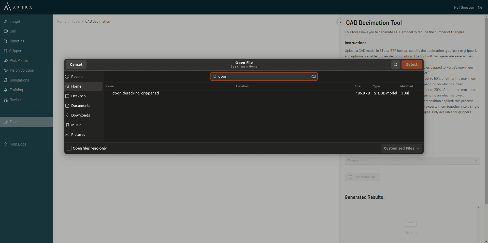 A new CAD viewer and optimization tool in Forge adds support for .STP files alongside .STL, enabling you to preview and decimate your CAD files directly within Forge. With this added flexibility, you can now decimate down your gripper mesh within Forge, download it to your VueController, and deploy it to Apera Vue for faster Autopilot operations with highly accurate collision geometry.