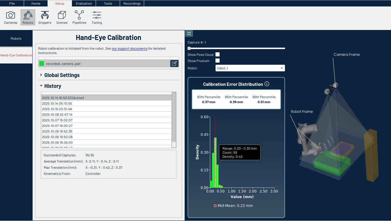 Apera Vue 9.51 delivers enhanced Robot Calibration, giving you more visibility into calibration results and enabling more accurate picks. New histograms give representative accuracy metrics across all calibration sample locations, empowering you with a deeper understanding of picking accuracy across the vision region.